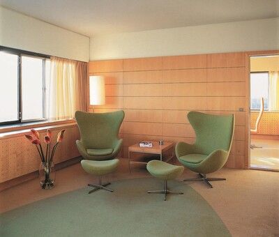 Tutto nell'hotel è impregnato dell'occhio di Arne Jacobsen per il design moderno ed elegante! Le sedie iconiche, il Cigno e l'Uovo, sono state progettate appositamente per il foyer dell'hotel e sono state pensate come una morbida controparte all'architettura spigolosa dell'edificio. Lo stile coerente è stato portato avanti fino in fondo e persino le posate, i comodini, le tende e la carta da parati sono stati disegnati da Arne Jacobsen.