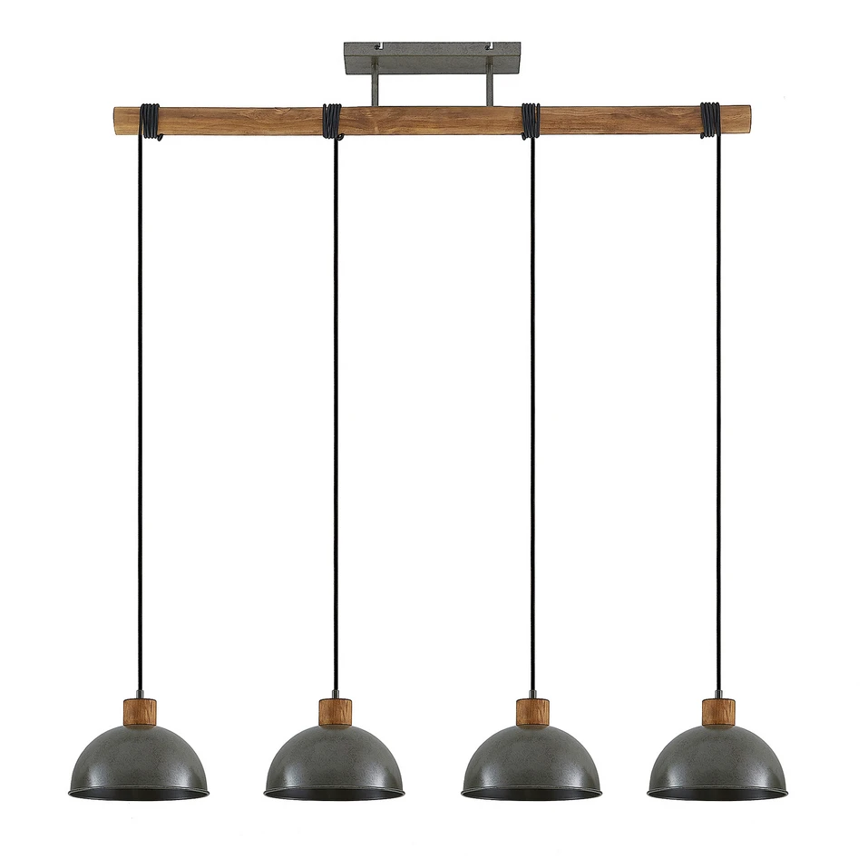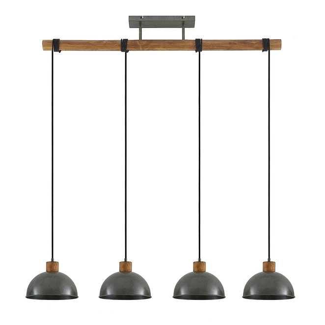 La lampada a Sospensione Durbis 4 Grigio scuro/Legno combina lo stile industriale con l'estetica moderna in una bella unione che si adatta facilmente agli interni grazie al suo design semplice e alla combinazione di colori neutri. La lampada ha un aspetto relativamente robusto grazie ai materiali robusti utilizzati nel design, in quanto la combinazione di legno e ferro conferisce alla lampada un bel peso e un aspetto solido. La struttura è costituita da una traversa di legno che sostiene i cavi di ciascun paralume. I cavi possono essere avvolti più o meno volte intorno alla traversa, consentendo di determinare l'altezza di ciascuna sorgente luminosa. Ad esempio, è possibile lasciare che tutte le Lampade siano appese alla stessa altezza per un aspetto equilibrato, oppure alternarle o formare una scala decorativa.