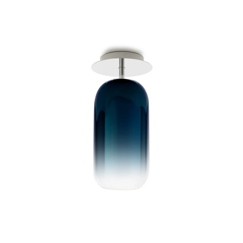Gople Mini Plafoniera Bluee Sapphire è una lampada emozionante e innovativa. Il bellissimo vetro soffiato a bocca è realizzato con un'antica tecnica veneziana che trasforma gradualmente il colore del vetro. Ogni lampada è quindi unica nel colore e può variare leggermente nella forma. La forma semplice della lampada mette in risalto il bellissimo gioco di colori e la finitura innovativa.