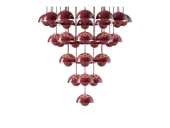 &Tradition presenta il lampadario Flowerpot VP10 Ø89 Dark Plum, dando vita all'iconico design di Verner Panton. Ispirata dai suoi ambienti immersivi, come quelli realizzati nei progetti Spiegel-Verlag del 1969 e nell'installazione "Pantorama" del 1979, la serie Flowerpot comprende ora anche i nuovi lampadari VP10. Questi possono essere configurati con 10 o 31 lampade a sospensione, consentendo la creazione di installazioni luminose di grande effetto.