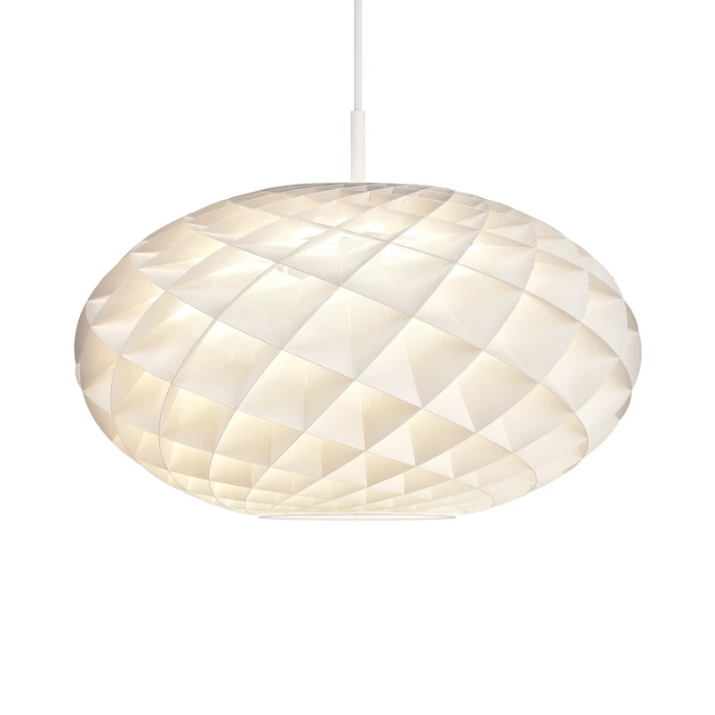 La Lampada a Sospensione ovale Patera è un'elegante sfera illuminata composta da piccole celle a forma di diamante. Ogni cella è stata progettata con cura per catturare la luce e incapsulare la sorgente luminosa in modo che non possa essere vista da angolazioni superiori ai 45 gradi. Ogni cella si illumina e le celle al di sotto dei 45 gradi sono aperte in modo da riflettere la luce verso il basso. Una parte della luce viene inviata verso l'alto, in direzione del soffitto.