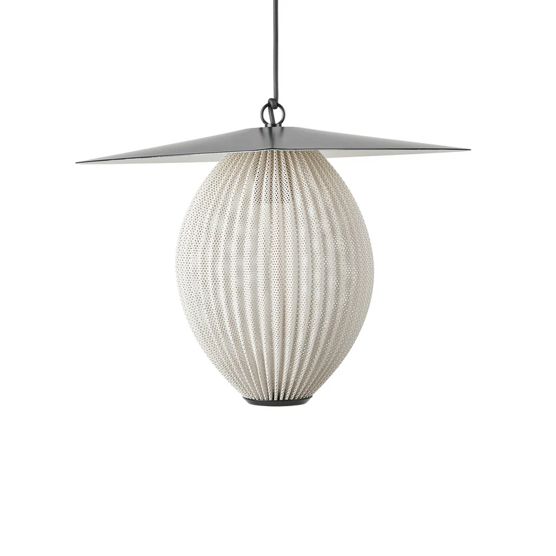 La Lampada a Sospensione Satellite Ø27 Crema Bianco/Nero è un bellissimo design che risale al 1953. La Lampada è particolarmente caratterizzata dal suo caratteristico paralume in rigitulle. Il rigitulle è una speciale tecnica di produzione inventata dal designer della lampada stessa, Mathieu Matégot, in cui una lastra di metallo viene piegata e ripiegata secondo una procedura specifica per formare una forma allungata con uno speciale aspetto tessile. Le forme morbide del paralume allungato hanno un aspetto delicato e organico che è splendidamente completato da un paralume esterno asimmetrico e triangolare che si trova come un cappello sopra la lampada, dando l'impressione di una lampada di design scultorea e orientata alla forma di alto valore estetico. Il paralume è perforato ed emette una luce morbida.
